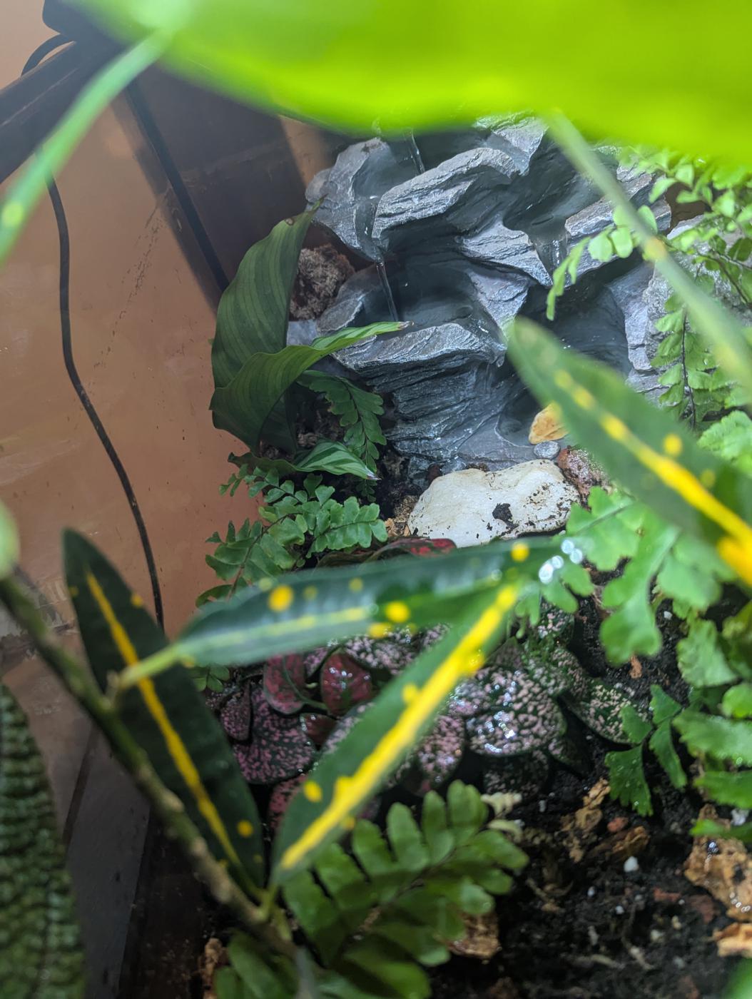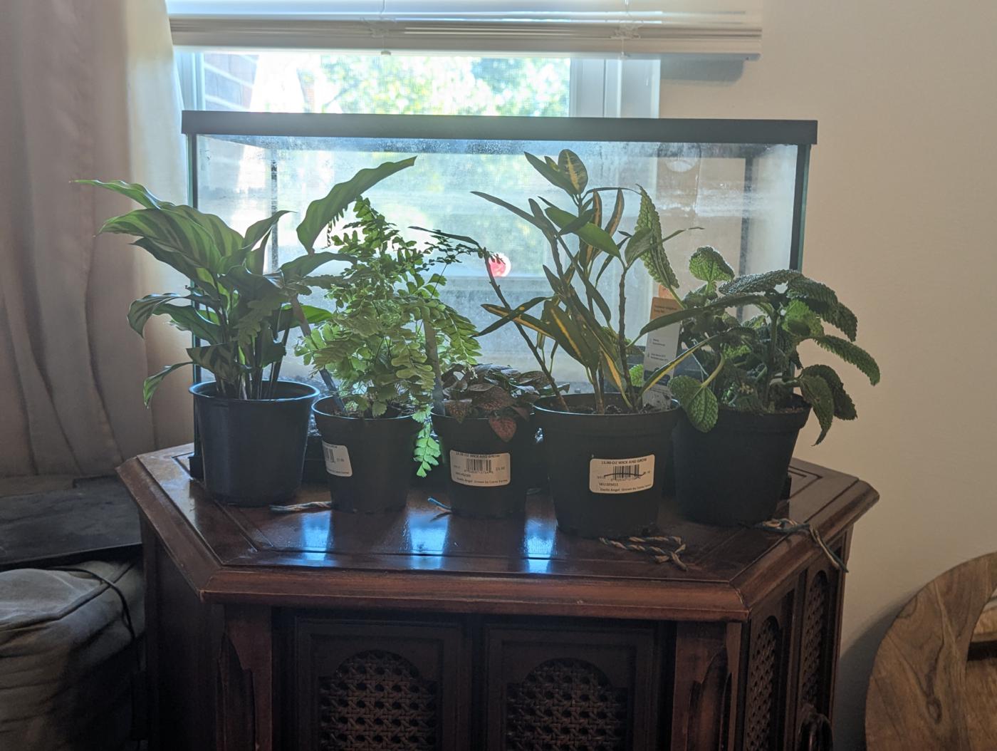 I got the Calathea from a school event; there was a table outside one of the buildings filled to the edges with common household plants. I chose one that I both liked and felt could work in the high humidity terrarium.